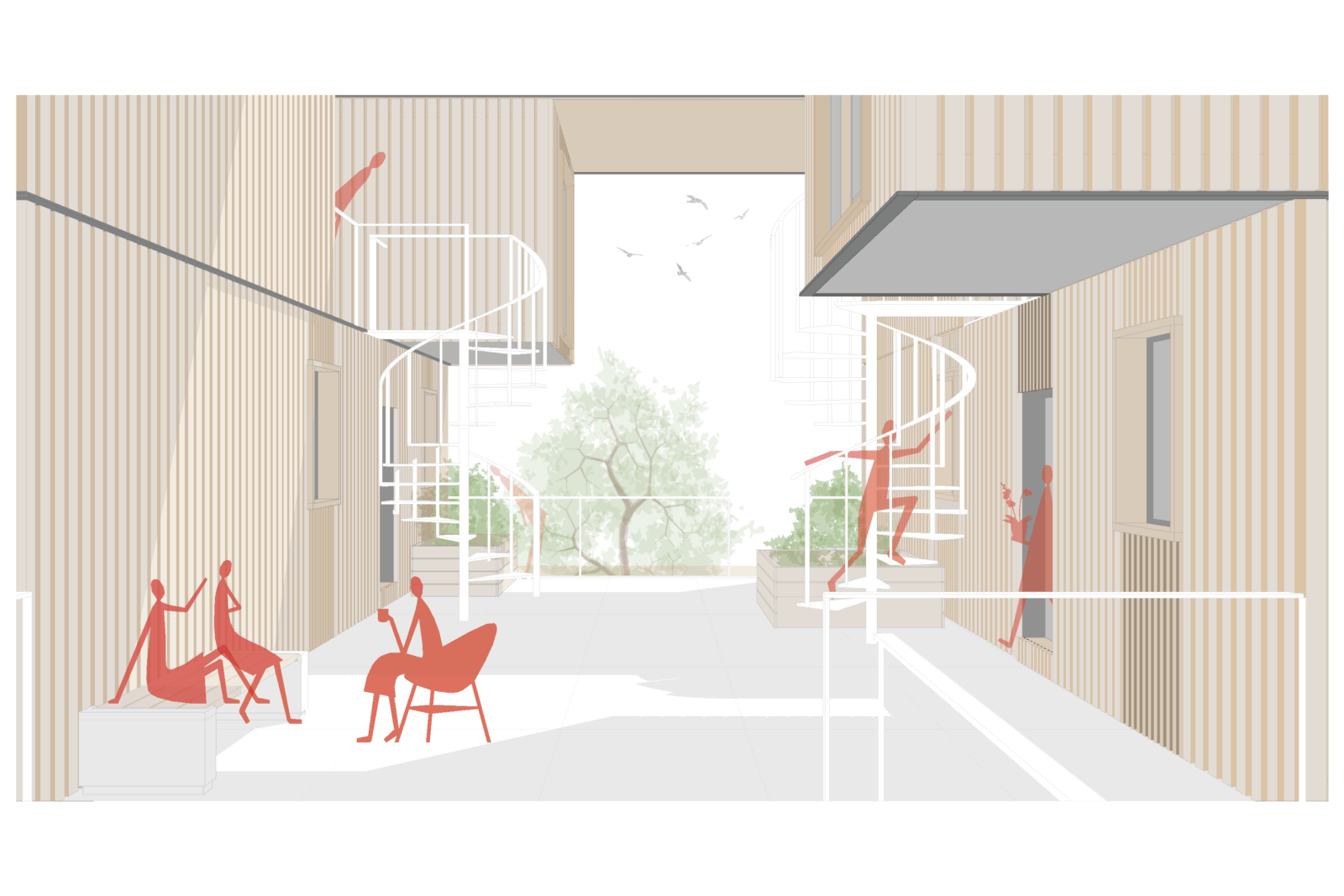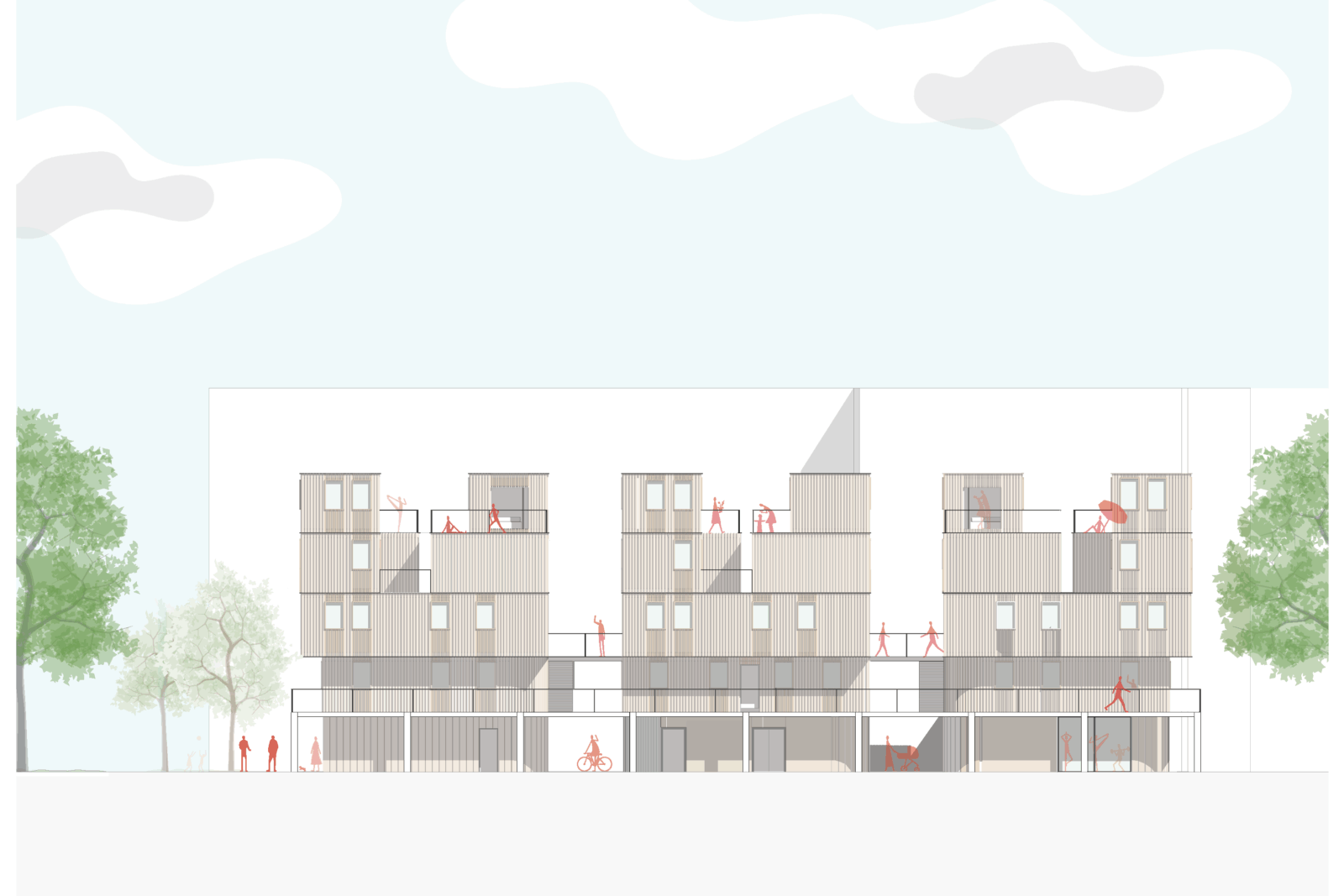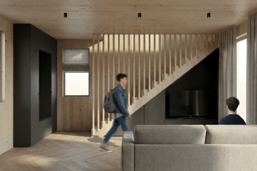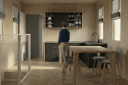 Das vorliegende Projekt stellt einen Ansatz für ein zeitgemäßes Studentenwohnheim, welches auf einem modularen Bausystem basiert, dar. Die Leitintention: nachhaltig und derart gestaltet, dass “echtes” Zusammenleben entstehen kann. Im Zentrum steht ein sogenanntes L-Modul, welches sich stapeln und überlagern lässt. Durch die daraus entstehende Struktur werden spannende Zwischenräume generiert– halböffentliche Bereiche und gemeinschaftliche Zonen, die gezielt Begegnungen fördern. Genau diese Orte machen ein lebendiges studentisches Umfeld aus und sollen mit gemeinschaftlichen Themen wie Kochbereichen oder Gemeinschaftsgärten bespielt werden. Im Erdgeschoss öffnet sich das Projekt zur Stadt hin: ein Café, Arbeitsbereiche und die Wohnheimorganisation schaffen eine offene, zugängliche „Basis“. Diese Zone bildet die Schnittstelle zwischen Bewohnern und Umfeld und macht das Gebäude zu einem aktiven Teil des Quartiers. Wesentlicher Gedanke hinter “WeiterWohnen” ist die Transformation, welche noch weitergedacht werden soll! Die Module sind nicht nur für die Phase des Studentenwohnens gedacht, sondern können durch Neu-sortierung nachfolgend aus als Tiny Houses weiterverwendet werden. So entsteht ein nachhaltiger und ressourcenschonender Lebenszyklus der einzelnen Bauelemente. Insgesamt verbindet “WeiterWohnen” modulare Architektur, gemeinschaftliche Räume und ein flexibles Nutzungskonzept – mit dem Ziel, ein Wohnumfeld zu schaffen, welches nicht nur Platz zum Wohnen bietet, sondern auch Raum für Austausch, Identifikation und Weiterentwicklung.